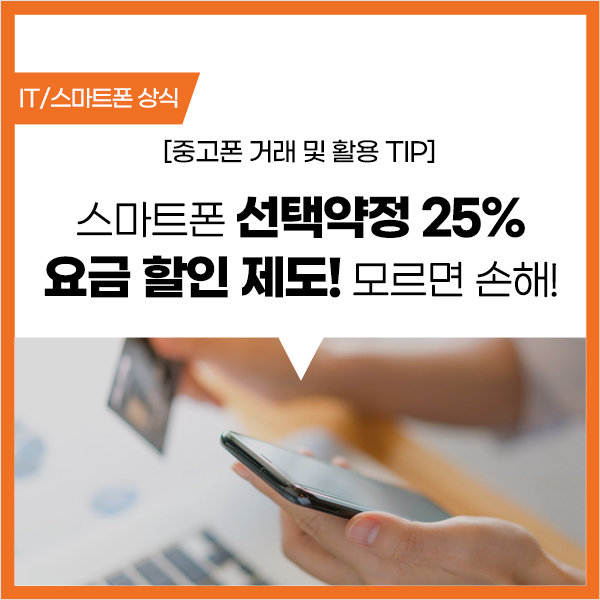 쉽게 말하면 '통신 요금 할인' 제도라고 보시면 됩니다. 우리는 보통 스마트폰 구입 후 통신사와의 약정 계약을 통해 통신 요금제를 지불하게 되는데요. 이 과정에서 선택약정할인제도는 단말기 구매 금액과는 상관없이 약정을 계약하고, 요금제를 선택하면 본인이 정한 요금제에서 매월 25%의 통신 요금을 할인받을 수 있게 해주는 제도라고 보시면 됩니다.